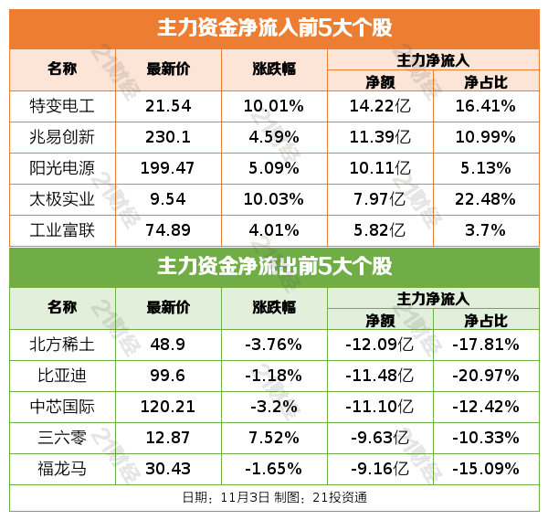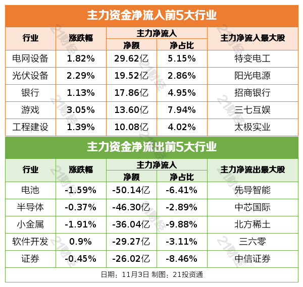 11月3日,市集探底回升,三大指数全线翻红。死心收盘,沪指涨0.55%,深成指涨0.19%,创业板指涨0.29%。沪深两市成交额2.11万亿,较上一个交易日缩量2107亿。
